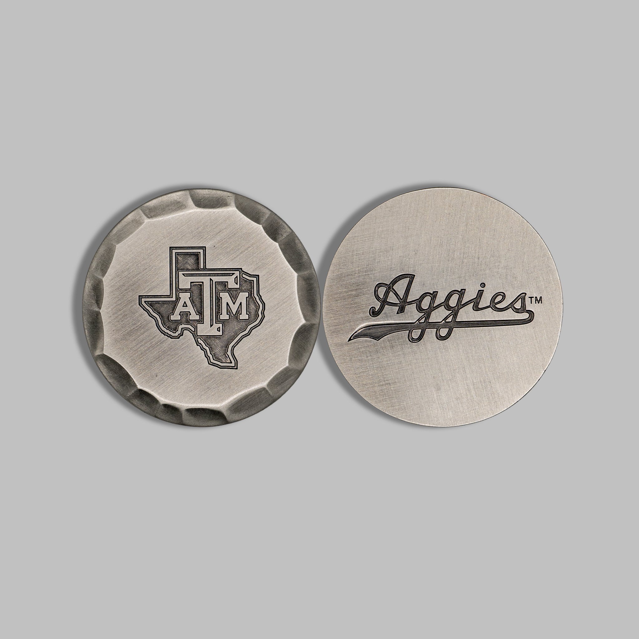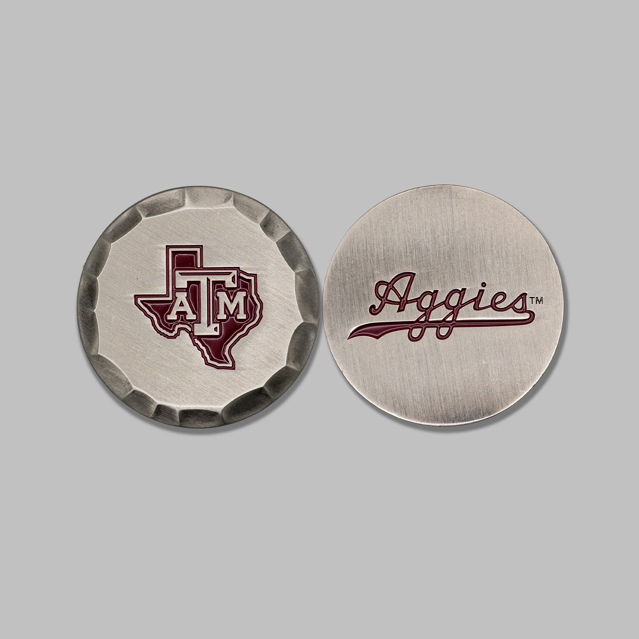 Elevate your Aggie golf game with an officially licensed Texas A&M® ball marker crafted for those who demand excellence in every detail. Precision-engraved on both sides and finished with a hammered edge texture, this piece delivers a perfect blend of tradition, craftsmanship, and on-course style.